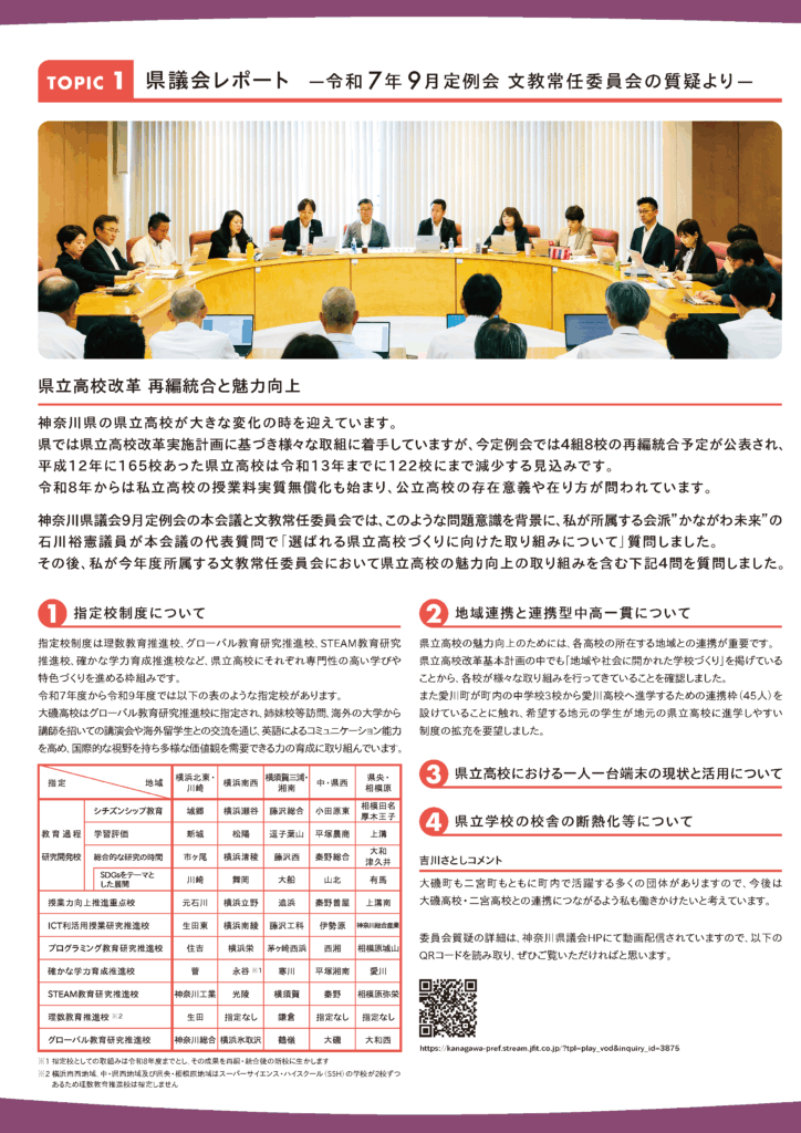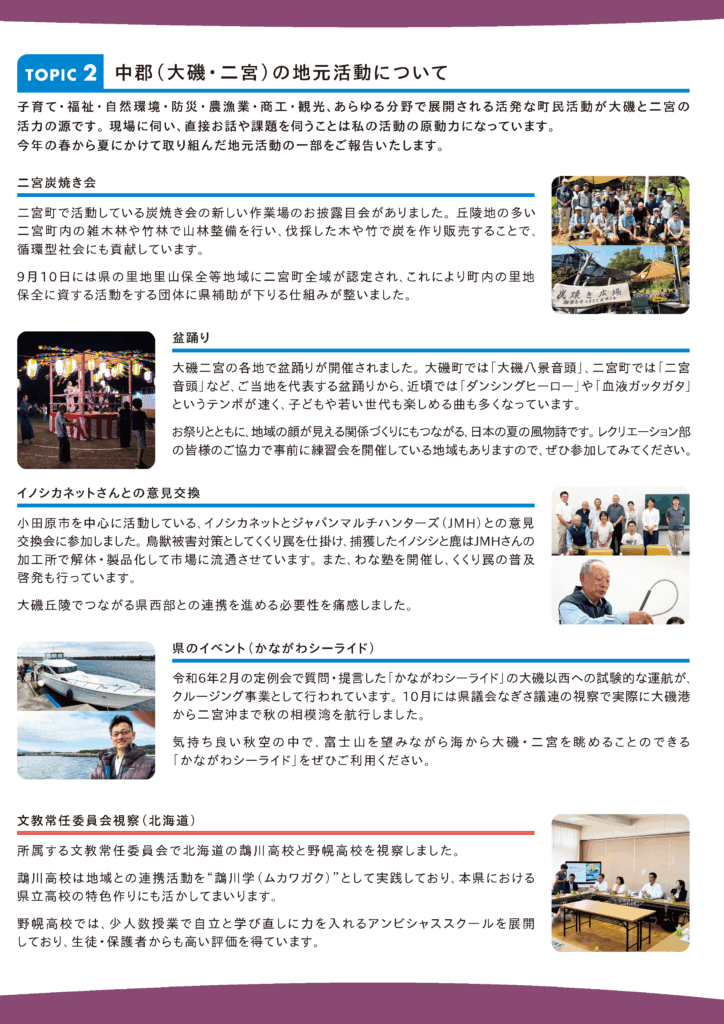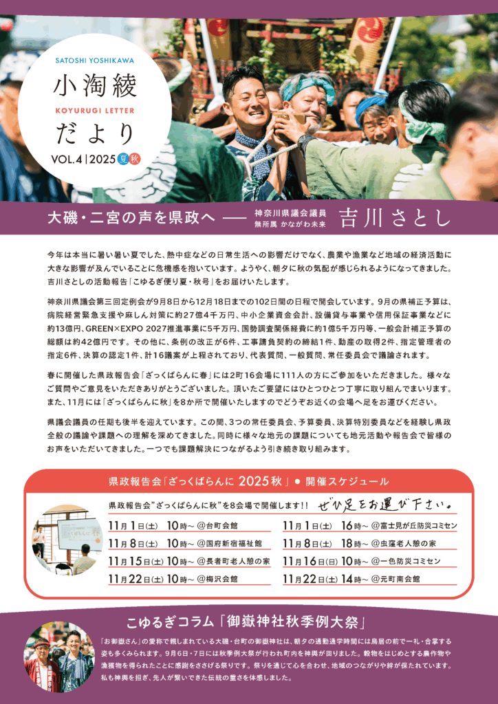 活動報告のために年4回発行しています、小淘綾だよりのvol.4が完成しました。今回のTOPIC1では9月の文教常任委員会で取り上げました県立高校改革について取り上げ、TOPIC2では地元での活動を含む議員活動のご報告をさせていただきました。ぜひご一読いただき、ご意見やご感想をお寄せください。