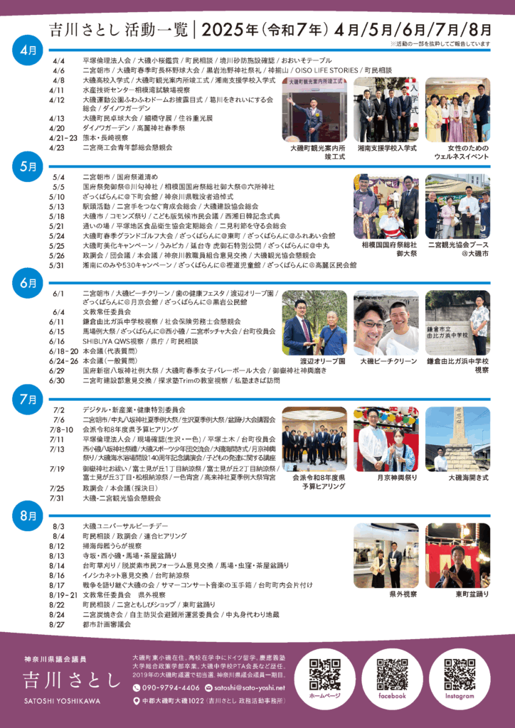 A.県議会が開かれている年間200日ほどは、県庁の新庁舎7階の会派室で団会議や行政との打ち合わせ、事務仕事をする時間が多くなります。県議会の閉会中は地元である大磯・二宮で町民の皆様から様々な行政相談をお受けし、また実際に現場に足を運んで視察を行うなどの地元活動をしています。